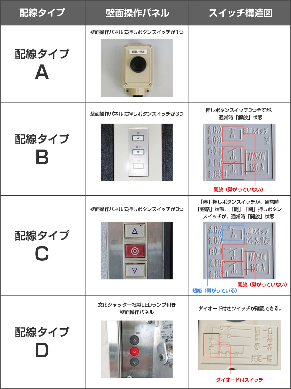 壁⾯操作パネルに押しボタンスイッチが3つ [開] [停] [閉] 押しボタンスイッチのすべてが、