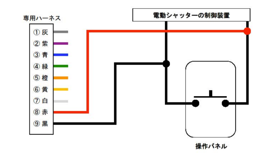 操作パネルの押しボタンスイッチから出ている ケーブルの⽚⽅に ⑧⾚ を接続してください。 もう⼀⽅のケーブルに ⑨⿊を接続してください。 このタイプは、極性がないので、 どちらをどちらに接続しても問題ありません。 この配線タイプの場合、①灰、②紫、③⻘、④緑、 ⑤橙、⑥⻩、⑦⽩ のケーブルは使⽤しませんので、 適宜、ハサミやニッパーで切ったのち、 絶縁テープを巻いて、絶縁処理をしてください。 以上で、配線タイプAの配線作業は完了です。