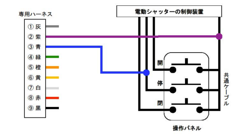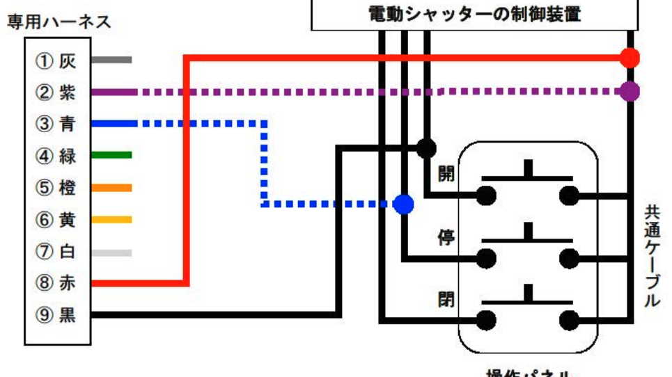 操作パネルの [開]押しボタンスイッチから 出ているケーブルのうち、共通ケーブルに 接続されていない⽅のケーブルと ⑨⿊ を 接続してください。